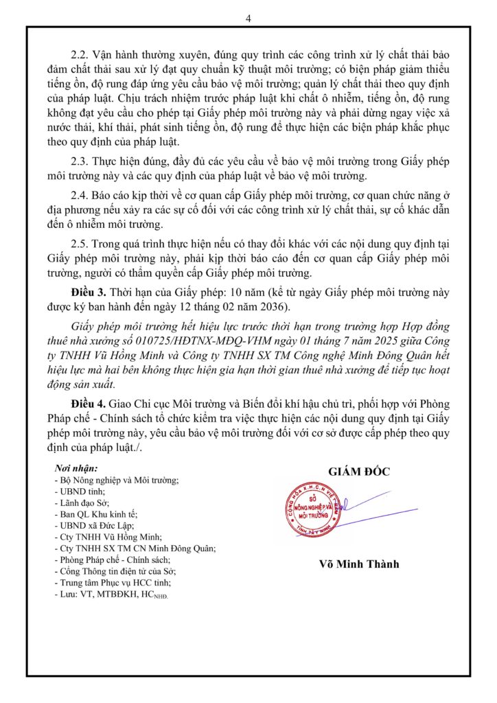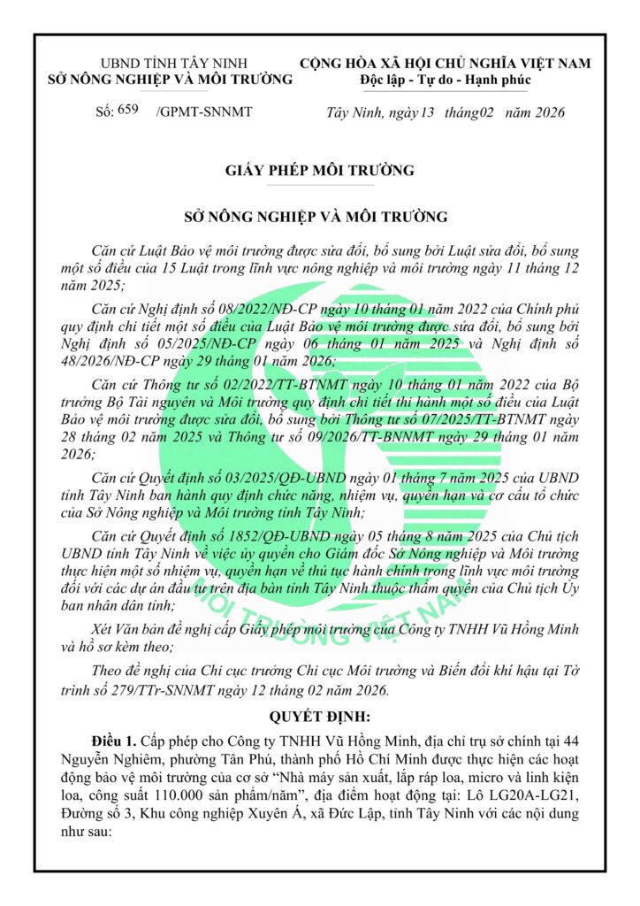 Vào ngày 13/02/2026, Công ty TNHH Vũ Hồng Minh đã chính thức nhận được Giấy phép môi trường số 659/GPMT-SNNMT do Sở Nông nghiệp và Môi trường tỉnh Tây Ninh cấp. Đây là bước đi quan trọng khẳng định sự phát triển bền vững và tuân thủ pháp luật của doanh nghiệp trong lĩnh vực sản xuất thiết bị điện tử âm thanh.
