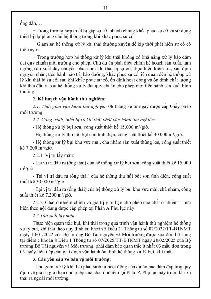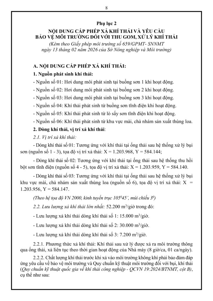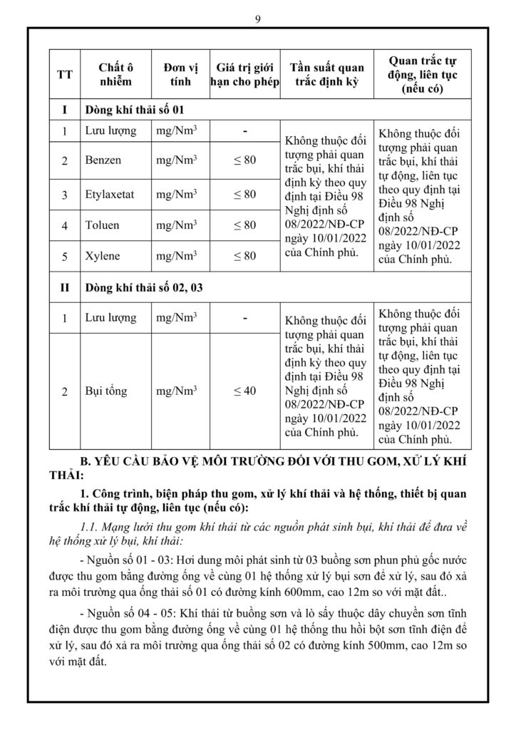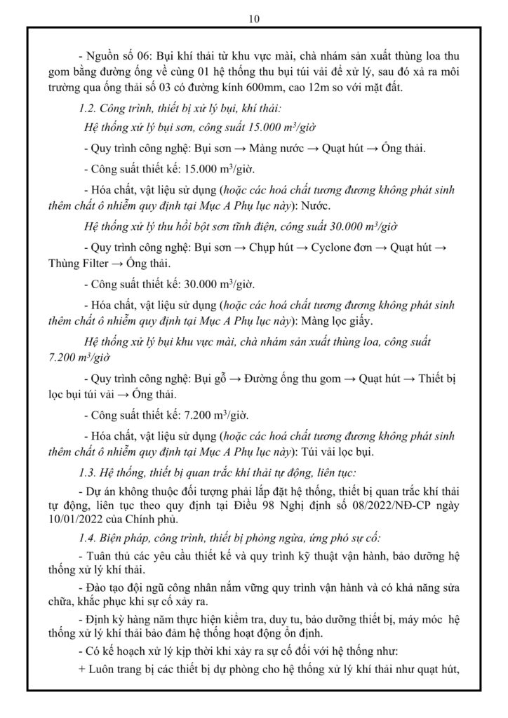 Cơ sở phát sinh khí thải từ 6 nguồn chính, được gom thành 3 dòng xả ra môi trường với tổng lưu lượng tối đa 52.200 m³/giờ. Để kiểm soát, nhà máy vận hành 3 công trình riêng biệt bao gồm: hệ thống xử lý bụi sơn bằng màng nước (15.000 m³/giờ), hệ thống thu hồi bột sơn tĩnh điện dùng Cyclone và màng lọc giấy (30.000 m³/giờ), cùng hệ thống lọc bụi túi vải cho khu vực chà nhám gỗ (7.200 m³/giờ). Các hệ thống này không yêu cầu lắp đặt thiết bị quan trắc tự động liên tục nhưng phải trải qua 06 tháng vận hành thử nghiệm, đồng thời chủ đầu tư phải trang bị sẵn thiết bị dự phòng, bảo dưỡng định kỳ và có trách nhiệm tạm ngừng dây chuyền để khắc phục ngay lập tức nếu xảy ra sự cố.