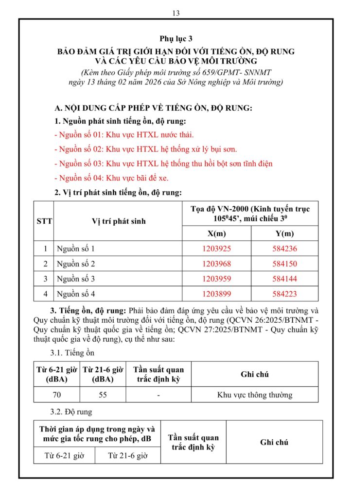Phụ lục 3 quy định các biện pháp bảo đảm giá trị giới hạn tiếng ồn và độ rung phát sinh từ 4 khu vực chính: hệ thống xử lý nước thải, hệ thống xử lý bụi sơn, hệ thống thu hồi bột sơn tĩnh điện và bãi để xe. Cơ sở phải tuân thủ nghiêm ngặt Quy chuẩn kỹ thuật quốc gia với mức giới hạn tiếng ồn tối đa là 70 dBA (từ 6-21 giờ) và 55 dBA (từ 21-6 giờ); giới hạn độ rung lần lượt là 70 dB và 60 dB cho cùng khung giờ tại khu vực thông thường. Để đạt được các tiêu chuẩn này, nhà máy áp dụng đồng bộ các biện pháp giảm thiểu như: đúc móng máy móc đủ khối lượng, lắp đặt gối đệm cao su chống rung, thường xuyên bảo dưỡng thiết bị, thay dầu bôi trơn và trang bị tai nghe chống ồn cho công nhân làm việc trực tiếp tại các khu vực có tiếng ồn lớn.