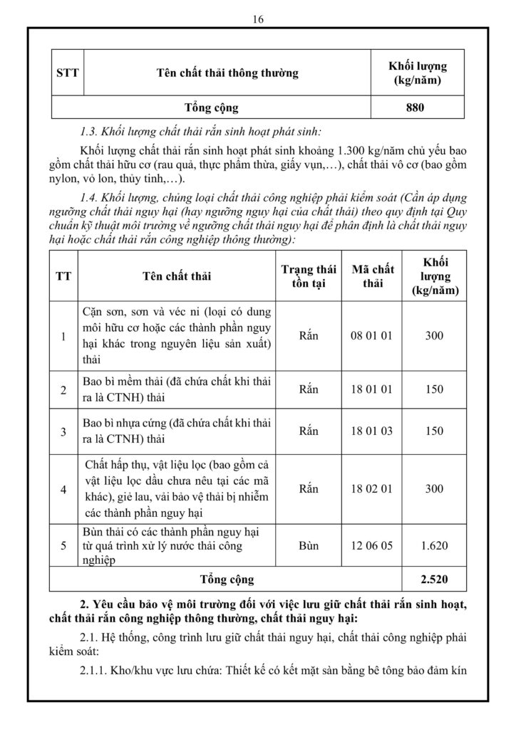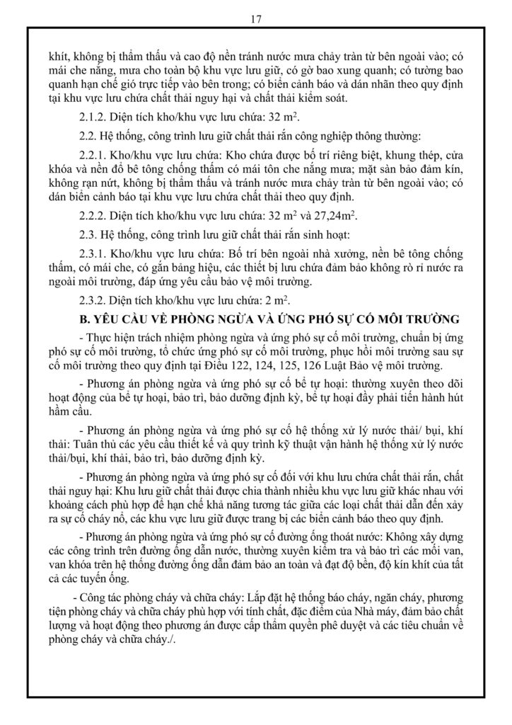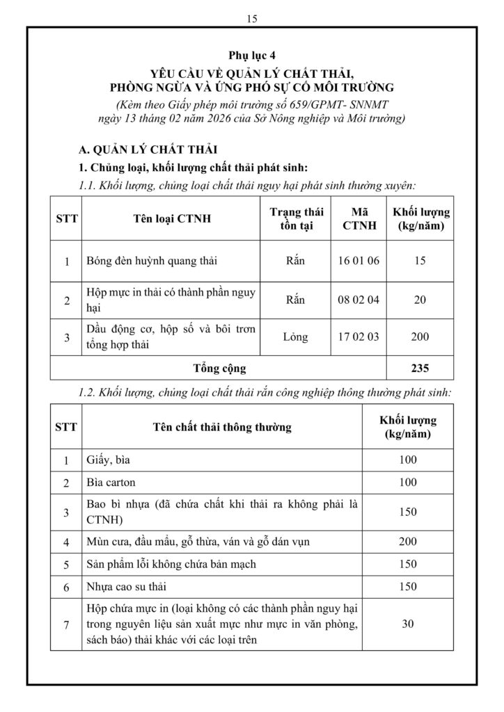 Phụ lục 4 quy định nghiêm ngặt về trách nhiệm quản lý 4 nhóm chất thải của nhà máy bao gồm: chất thải nguy hại (235 kg/năm), chất thải công nghiệp phải kiểm soát (2.520 kg/năm), chất thải rắn công nghiệp thông thường (880 kg/năm) và rác sinh hoạt (1.300 kg/năm). Để kiểm soát an toàn, công ty phải xây dựng các kho lưu chứa riêng biệt với tổng diện tích gần 100 m² được đổ nền bê tông chống thấm, có gờ bao và mái che chắn. Đồng thời, cơ sở cam kết thực hiện đồng bộ các biện pháp phòng ngừa sự cố bằng cách bảo dưỡng định kỳ hệ thống xử lý môi trường, giám sát hệ thống đường ống, tách biệt khu vực lưu trữ để tránh phản ứng hóa học và trang bị hệ thống phòng cháy chữa cháy đạt tiêu chuẩn.
