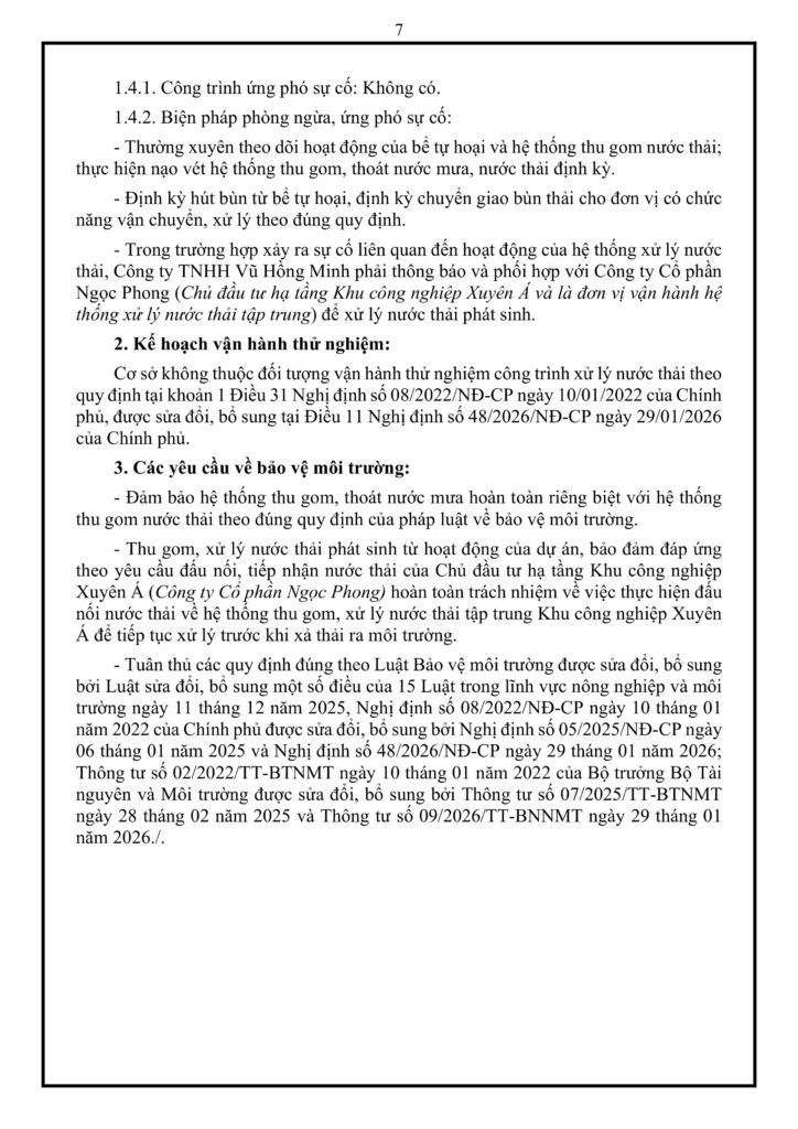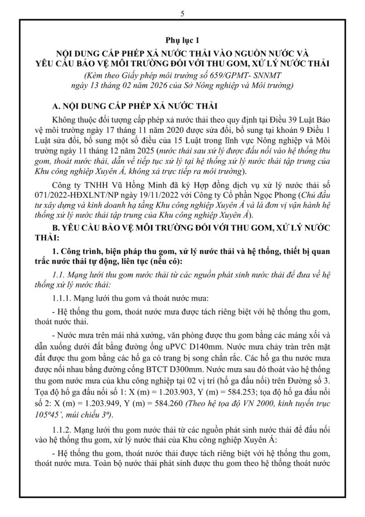 Dự án của Công ty TNHH Vũ Hồng Minh không thuộc đối tượng cấp phép xả nước thải trực tiếp ra môi trường do toàn bộ nước thải sau xử lý được đấu nối vào hệ thống tập trung của Khu công nghiệp Xuyên Á. Nhà máy vận hành mạng lưới thu gom nước mưa và nước thải tách biệt hoàn toàn đưa các nguồn nước thải sinh hoạt và sản xuất về hệ thống xử lý nội bộ có công suất 15 m³/ngày đêm. Cơ sở này không yêu cầu phải lắp đặt hệ thống quan trắc nước thải tự động liên tục và không thuộc diện phải vận hành thử nghiệm công trình xử lý , nhưng chủ đầu tư có trách nhiệm nạo vét đường ống, hút bùn định kỳ và phối hợp chặt chẽ với đơn vị quản lý hạ tầng khu công nghiệp để kịp thời xử lý nếu có sự cố xảy ra.