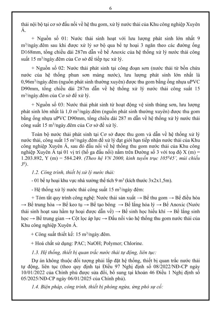 - Quản lý nước thải: Hệ thống thu gom và xử lý nội bộ đạt công suất 15 m3/ngày đêm trước khi đấu nối vào hệ thống xử lý tập trung của KCN Xuyên Á.