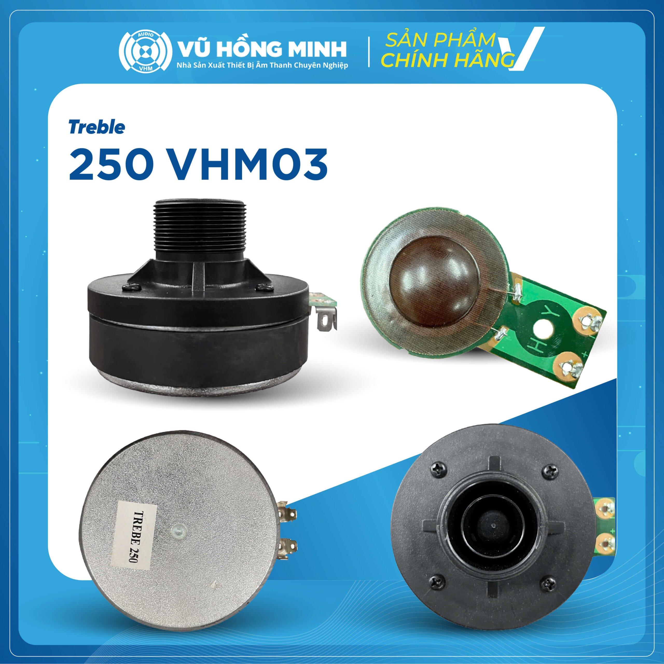 Treble 250 – VHM03 là dòng treble driver mạnh mẽ, thiết kế theo chuẩn họng ốc 250, cho dải cao sáng, bén và lan tỏa tốt. Sản phẩm phù hợp cho loa kéo, loa thùng công suất lớn, loa sự kiện và các bộ âm thanh DIY cần tiếng treble mạnh – rõ – ít méo.