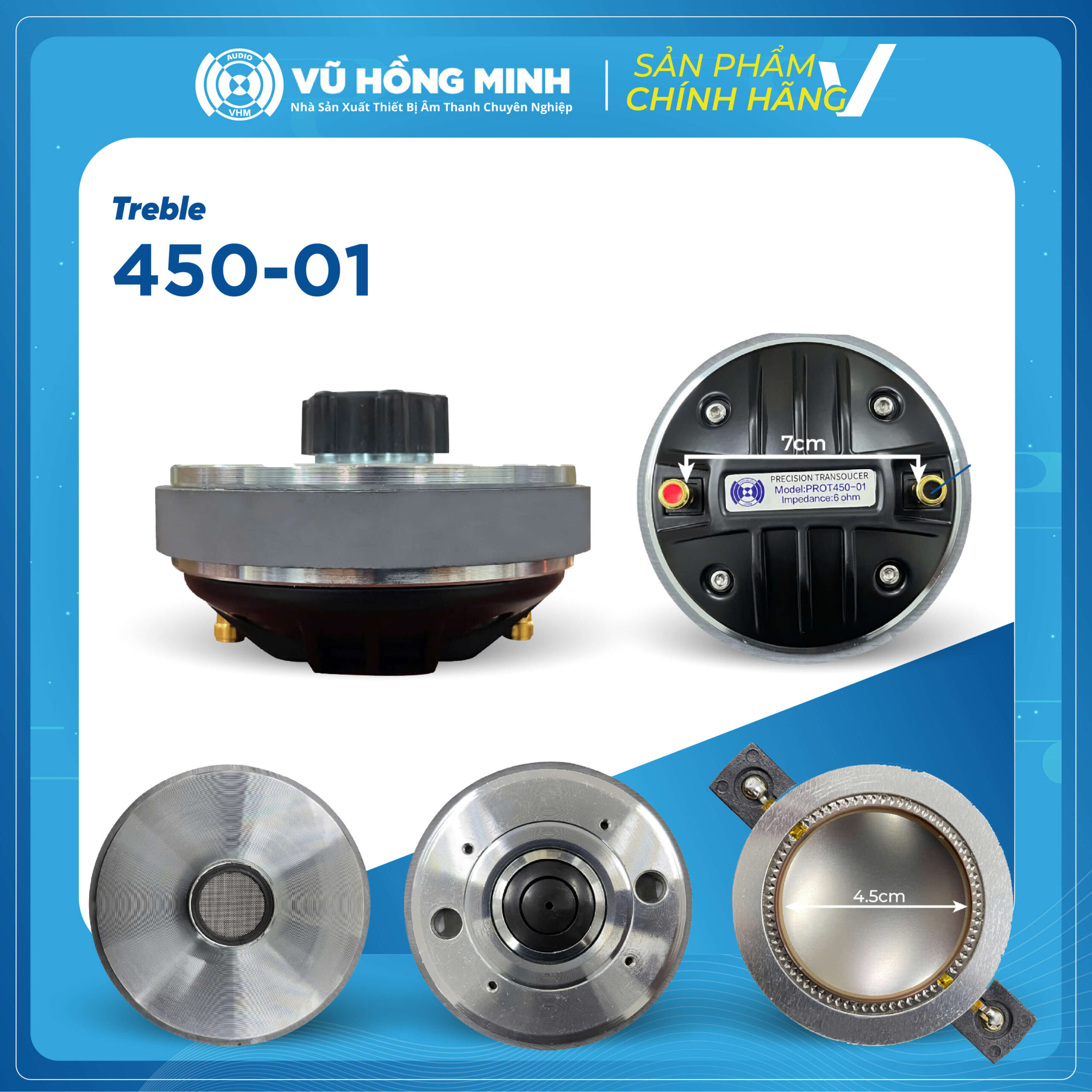 Treble PROT450-01 là củ treble dòng PROT 450 cao cấp, thiết kế họng 4,5cm cho dải cao sáng, trong và chi tiết, phù hợp cho các hệ thống loa sân khấu, loa kéo, loa full, sub full range cần tiếng treble mạnh và rõ.